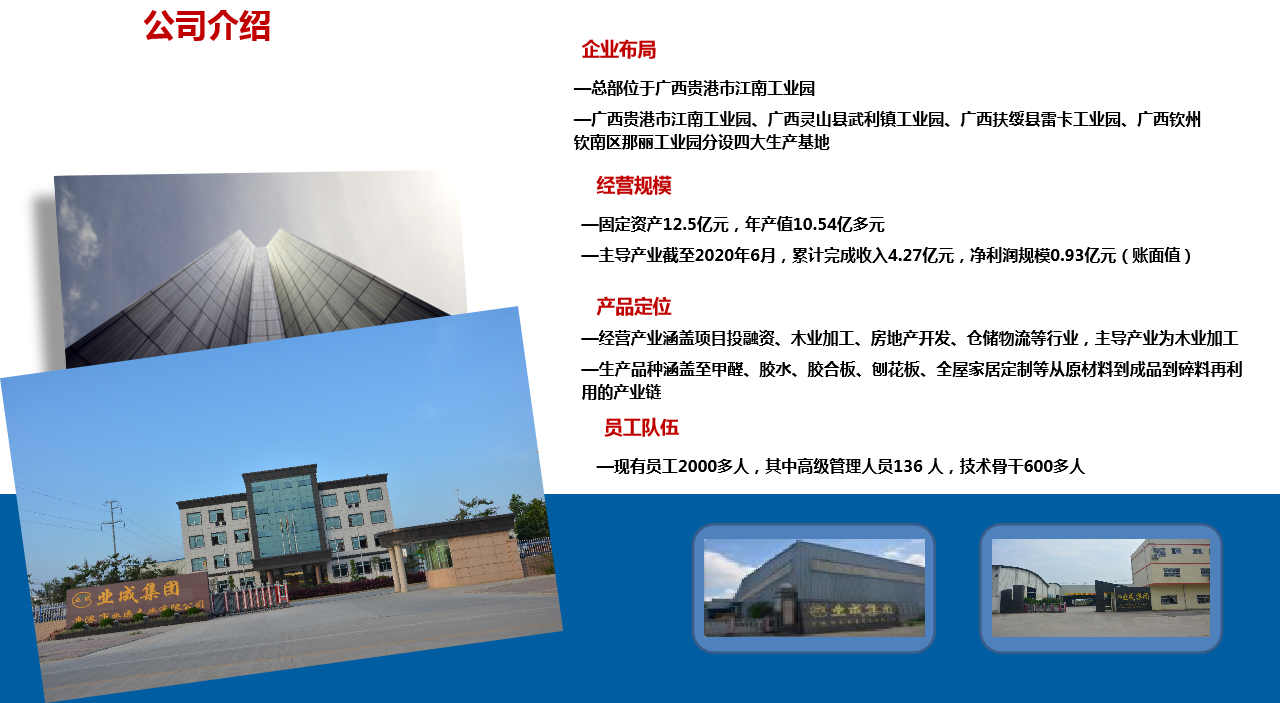 廣西貴港市業(yè)成投資集團(tuán)(以下簡稱:業(yè)成集團(tuán))成立于2013年7月,總部設(shè)在廣西貴港市江南工業(yè)園,兩大生產(chǎn)基地分布在廣西貴港市江南工業(yè)園、廣西靈山縣武利鎮(zhèn)木業(yè)產(chǎn)業(yè)園,員工2000多人,固定資產(chǎn)12.5億元,年產(chǎn)值10億多元,經(jīng)營產(chǎn)業(yè)涵蓋項(xiàng)目投融資、木業(yè)加工、房地產(chǎn)開發(fā)、倉儲物流等行業(yè),主導(dǎo)產(chǎn)業(yè)為木業(yè)加工。...